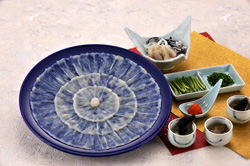刺身に出来た溝が食べる時にポン酢や薬味に絡みやすく、重厚で独特の食感と共にふぐ本来の旨味が倍加される、匠の技です。