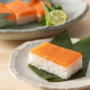 新鮮でほどよく脂ののったマス、立山連峰から流れ出る清流に育まれた富山県産米、芳ばしい香りと鮮やかな色彩の国産生笹を使った